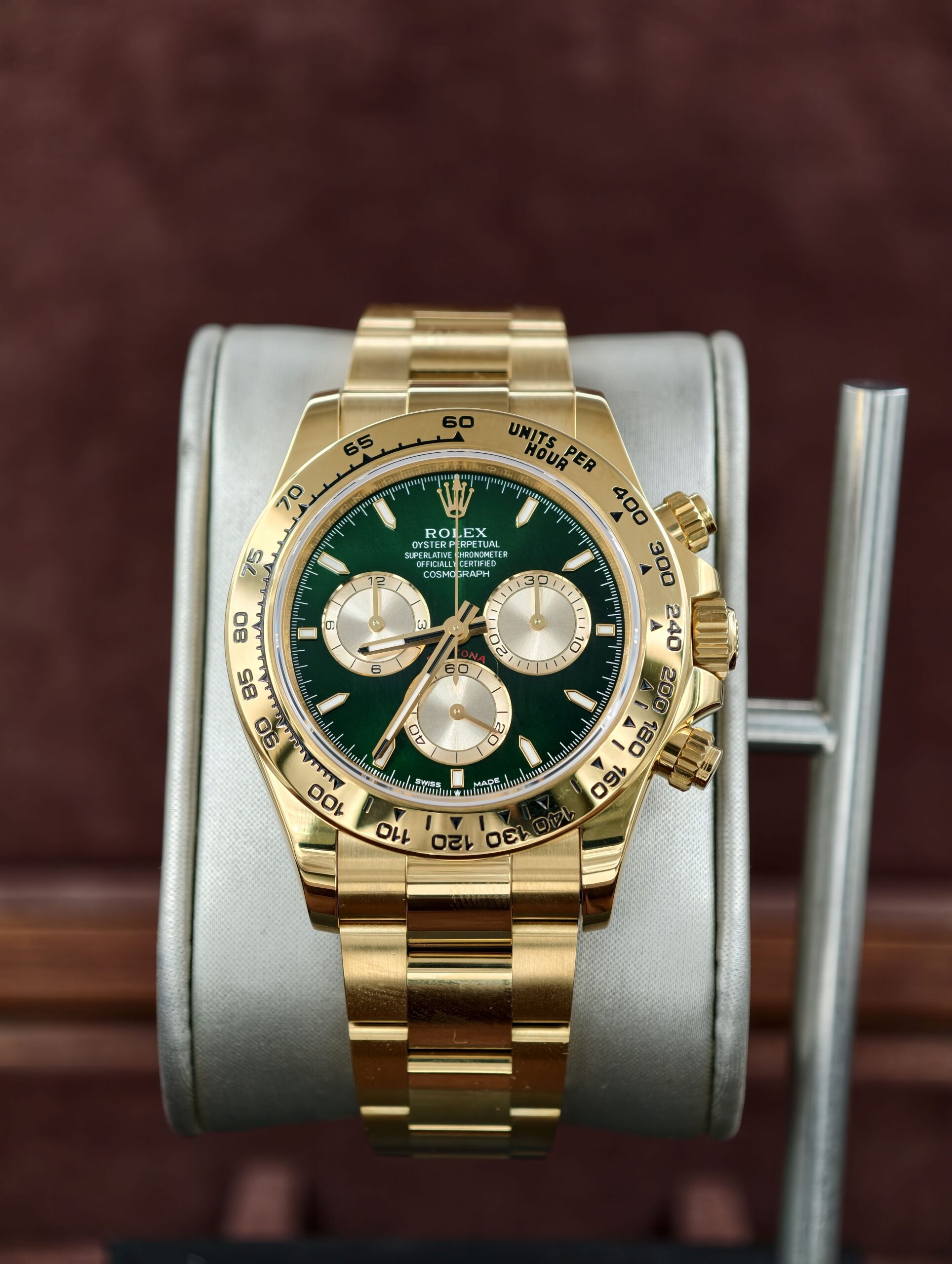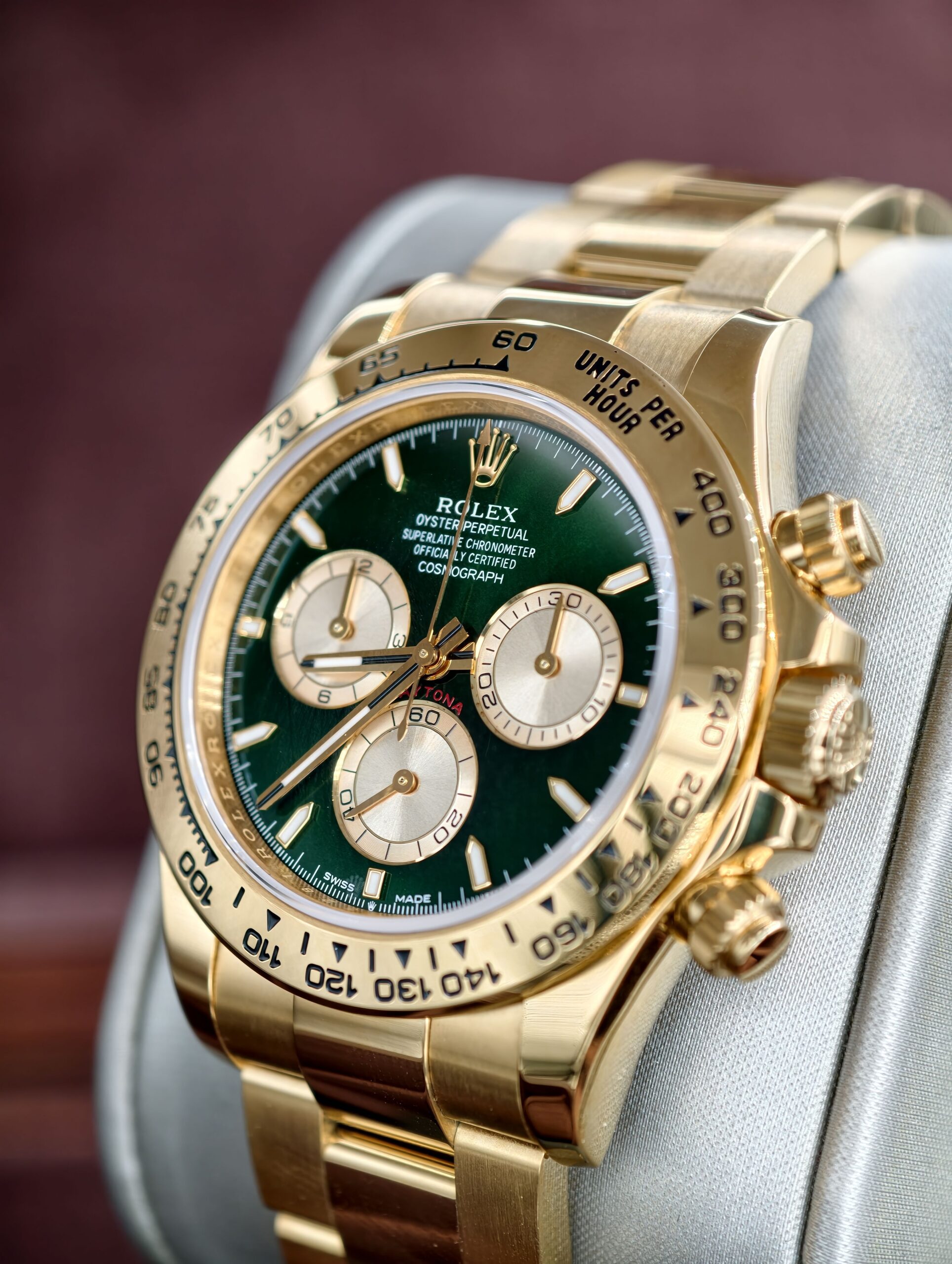 Equipped with the 4130 integrated automatic movement, the greatest highlight is the gold-green dial whitch is eveloped over two years, it achieves an exceptionally close match to the original, the same as the black-filled sub-dials whitch is also replicated the matte texture identical to the authentic version.